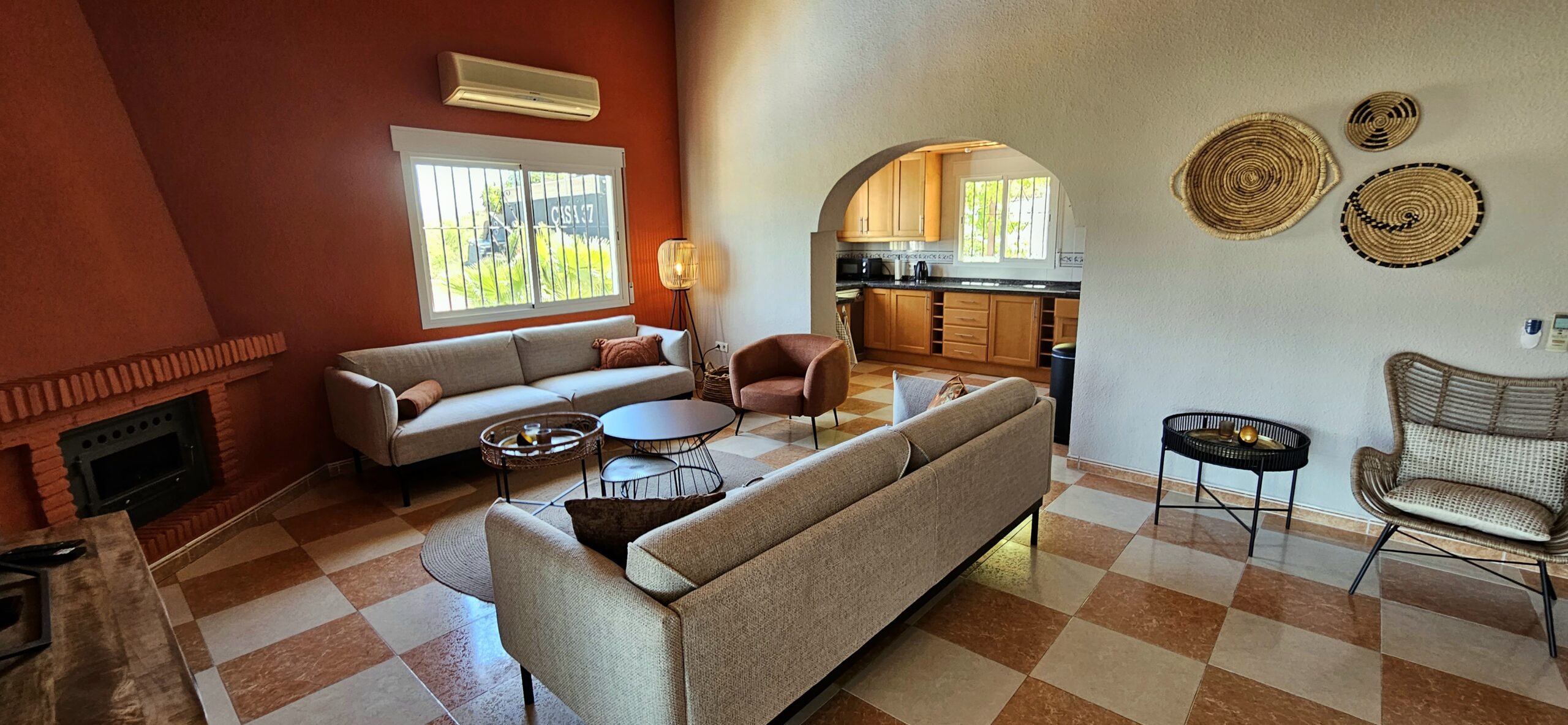 De woonkamer beschikt over een comfortabele zithoek met televisie. De eethoek bevindt zich in de serre en heeft prachtig uitzicht over het stuwmeer en de bergen. In de avond zijn de omliggende dorpjes verlicht waardoor het een sprookjesachtig uitzicht geeft. De keuken is ruim en beschikt over een inductiekookplaat, koel-vriescombinatie, oven, magnetron, vaatwasser, waterkoker, staafmixer, broodrooster en koffieapparaat. Alles is aanwezig om samen te koken of bakken. In de hal bevindt zich een extra toilet.